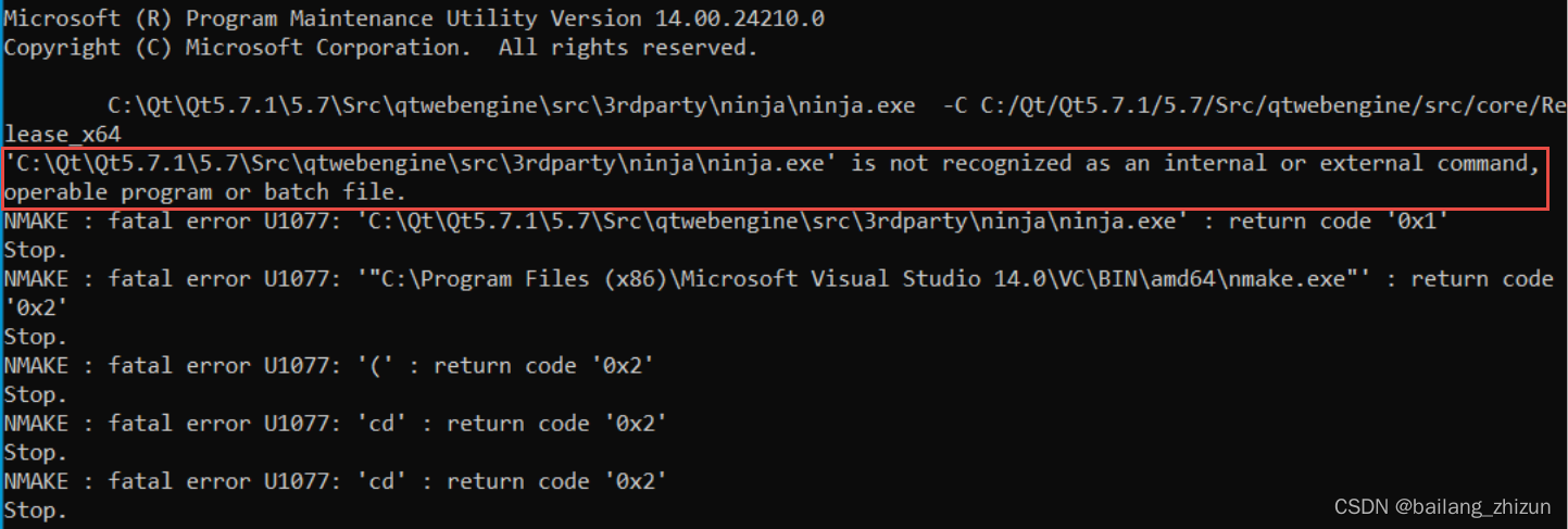 这个ninja.exe是在编译过程中生成的执行程序,但因为某个未知原因造成此次编译没有正常生成(怀疑是因为没有把vs2015设置成英文有关,虽然把vs2015设置成英文之后还是会报这个错误doge,也有可能是因为没有把nmake所在目录添加至环境变量)