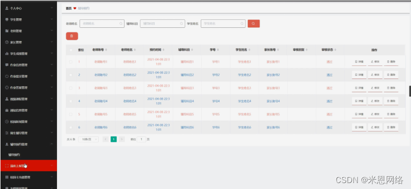 辅导预约管理,在辅导预约管理页面可以对索引、老师账号、老师姓名、预约时间、辅导科目、学号、学生姓名、家长账号、审核回复、审核状态等内容进行详情、修改或删除等操作,如图5-10所示。