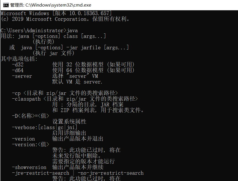 按住Window+R ,输入cmd,回车,在cmd命令行分别输入java和javac(可以不区分大小写) ,出现如下图所示的画面而不是“javac不是内部变量……”即表示安装成功。