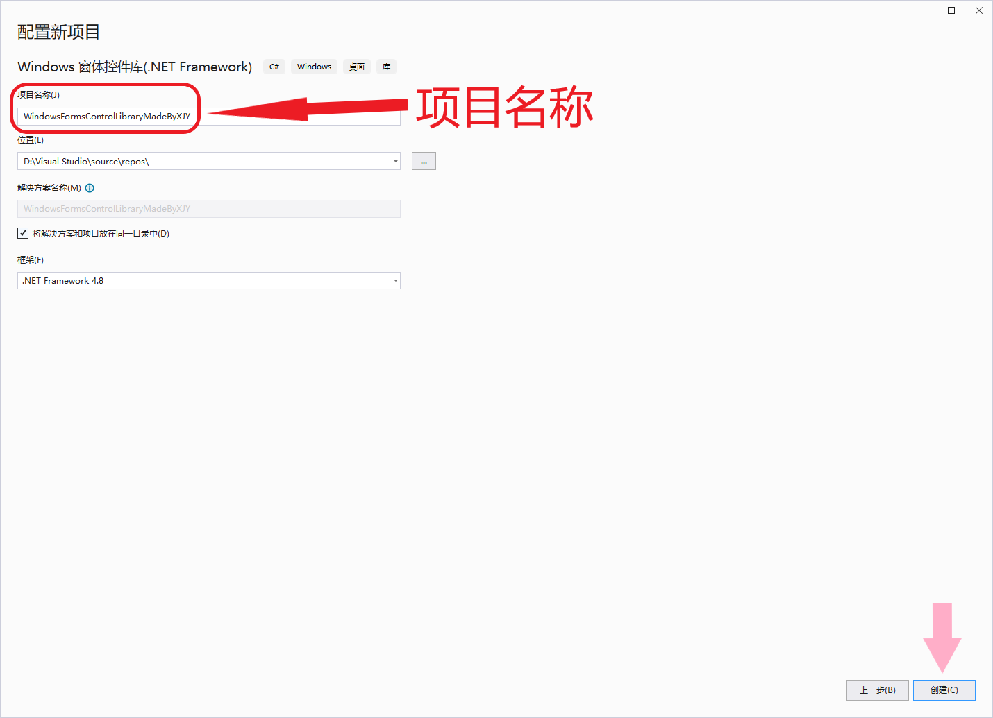 在项目配置页面同样自行命名并指定位置,选择“创建新解决方案”,随后点击“创建”: