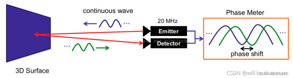 实际应用中,通常采用的是正弦波调制。由于接收端和发射端正弦波的相位偏移和物体距离摄像头的距离成正比(见后面推导),因此可以利用相位偏移来测量距离。图3.6是连续波调制原理示意图: