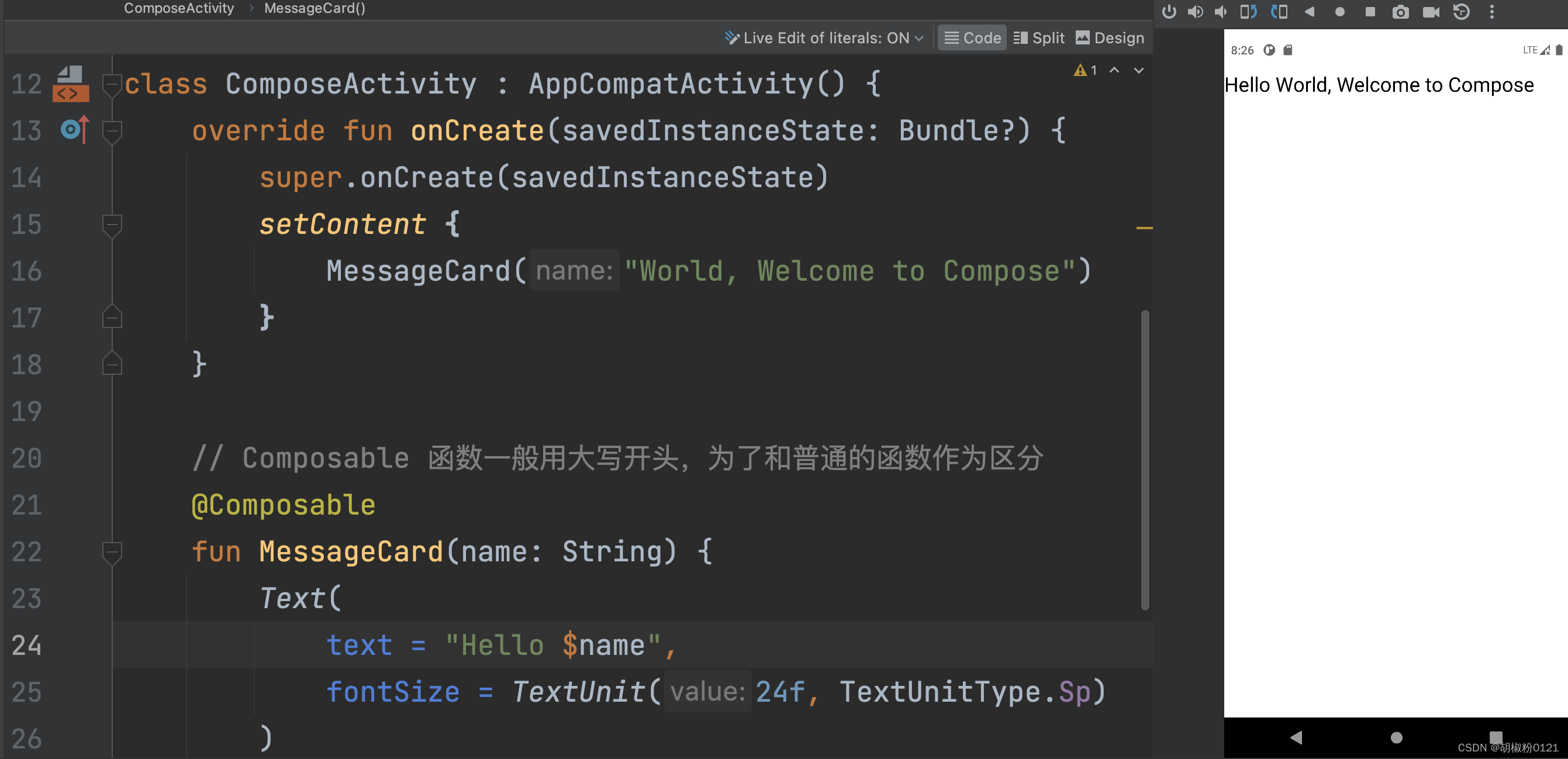 Composable函数必须不能有任何参数。因为这个限制,你不能直接预览MessageCard()函数。 - 但是,你可以尝试写第一个叫